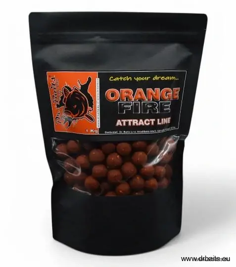 Orange fire ATTRACT line, je boilies určený na docielenie rýchleho záberu. Vynikajúca vec na preteky a krátkodobé vychádzky. Boilies je postavený na dráždivom mixe vybraných druhov chilli a rôznych odrôd paprík. Mix celkovo obsahuje 40 % triedených rybích múčok, 10% pečeňových extraktov, pečeňových proteínov. Použitie kvalitných vtáčích zobov, mliečnych proteínov zaručuje vysokú stráviteľnosť a uvoľňovanie atraktorov do vodného prostredia. Samotná vôňa boilies pripomína lahodnú klobásovú vôňu s ľahkým podtónom cesnaku.